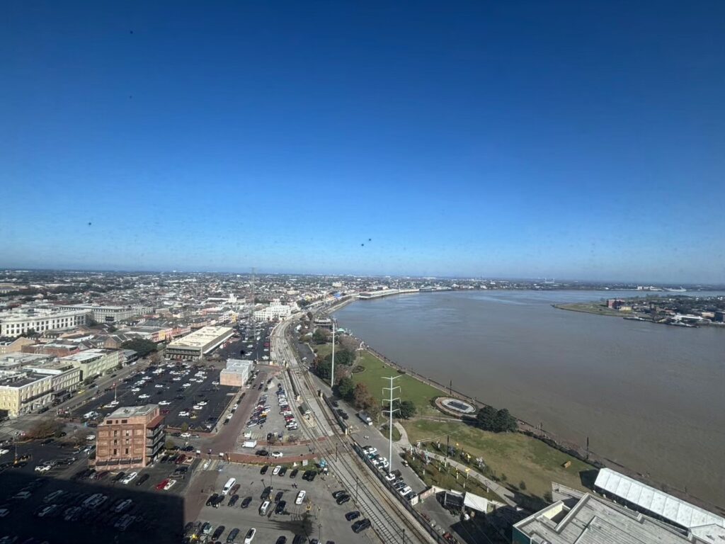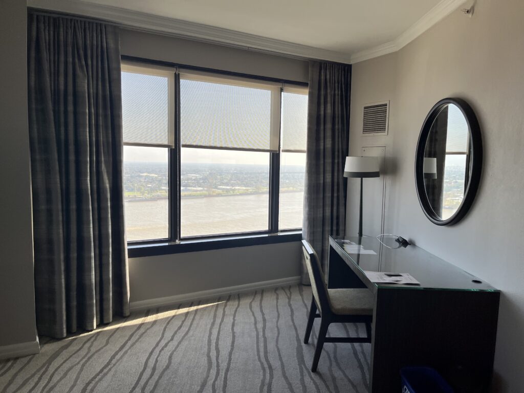 お部屋からの景色。ミシシッピ川を一望できました。左側には、フレンチクォーターやカナルストリートも見えます。